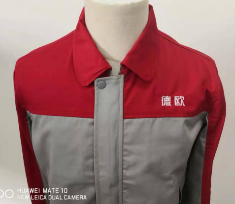 德欧汽车位于四川省,其公司的春秋工作服定做款式主要以红色拼灰色为主。