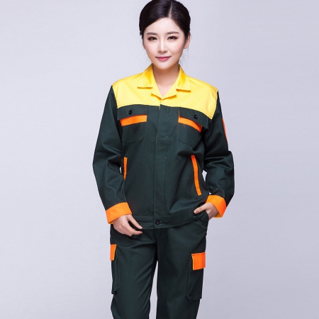 苏州鹰诺服装:墨绿拼黄色汽修工作服