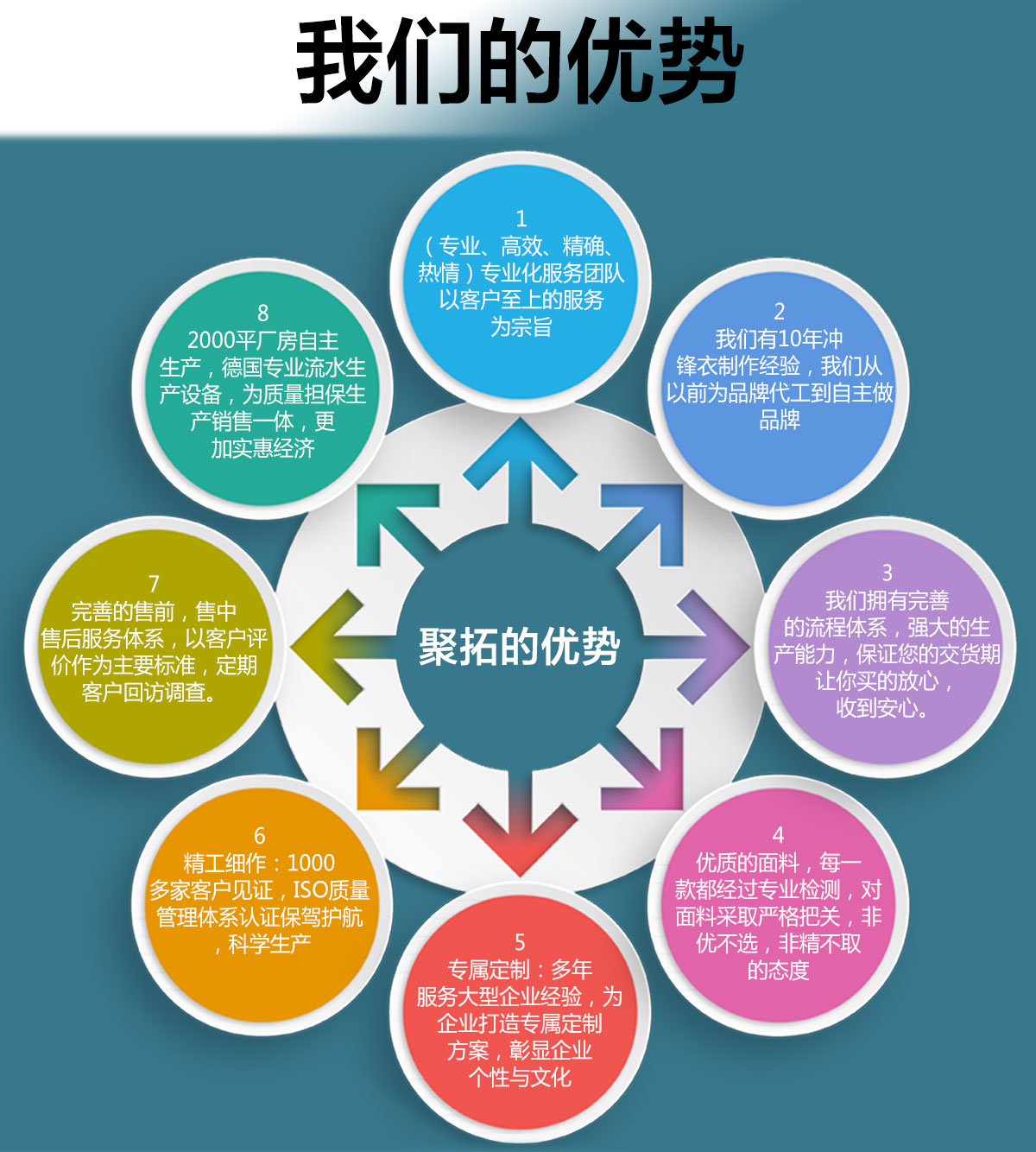 正是坚守着这种信念,历经16年的发展,由最初的10多人的起家的小企业,发展到今天拥有企业盐城骏放服饰,苏州鹰吉派劳保,苏州凯宏劳保下属3家企业,员工人数5000余人的大型企业,2001年按国际惯例组建了三大中心,生产中心以白大褂为龙头,推动其它产品,如t恤,西服,冲锋衣,安全帽等,营销中心从事产品开发和市场销售,目前遍及全国的营销网络已经形成。售后中心以帮助顾客解决问题的原则,7*24小时服务!
