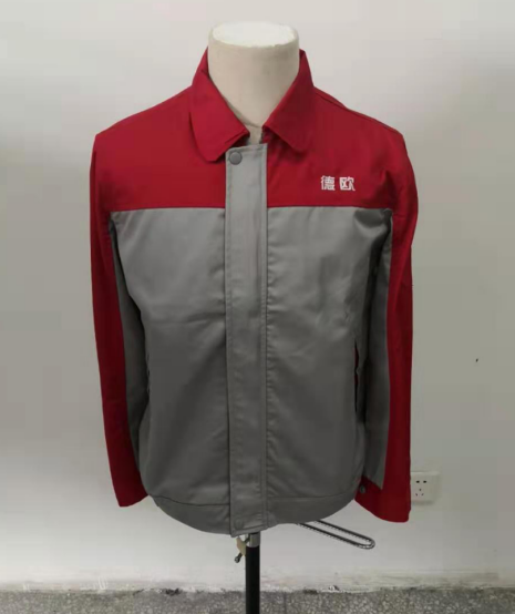 德欧汽车位于四川省,其公司的春秋工作服定做款式主要以红色拼灰色为主。